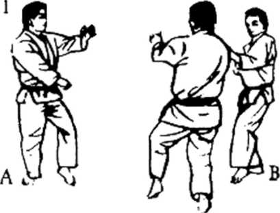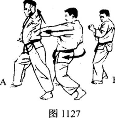 (6) 因为我方深入左方对手的侧面,所以拨开踢技的姿 势,自然位于A的背商,这时,要一而扭转腰部,一面把重心落 在B的方向,朝背面使出左正拳突技(图1127),