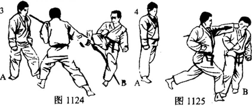 (5) 对于A的踢技,要以4的姿势的左脚为轴,移动右 脚,踏向A的侧面,以身体拨开挡住(图1126)这时重心落在 左脚