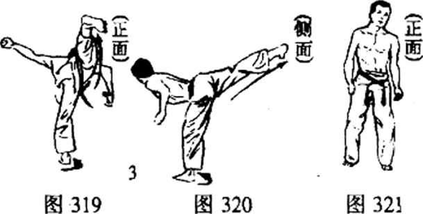 (2) 图310把支撑脚部的脚跟,朝对方的一制扭转,踢脚的膝盖朝 前方拾起,(不必像关节踢抬得那么高)。