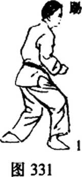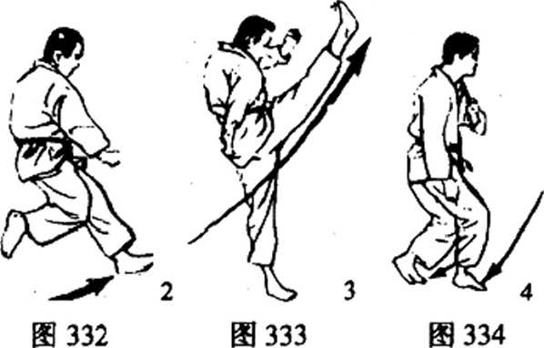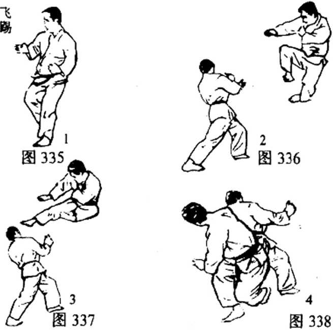 连环踢的第一击,有时当作攻招,有时只用来牵制对方, 飞踢(图335?338)