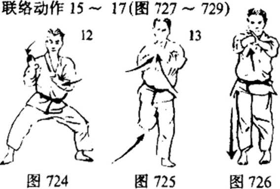 右脚后退,摆出半后屈立的架式,把14时的左添手原状推 向前方,使出底掌突技。右脚摆出半后屈立的同时,朝后方使 出手肘撞招式。在联络动作17, 一面把半后屈立的腰部朝正 面回转,一面改摆半前屈立架式,移向15的手肘撞招式6 (15)左半前屈立,右手肘撞(图730)