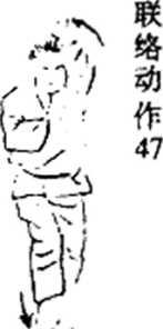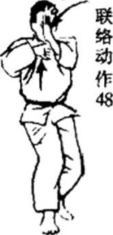 联络动作47,底掌接招的左手放在头上,而攻击的右手应 该通过身体内侧》