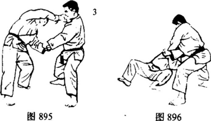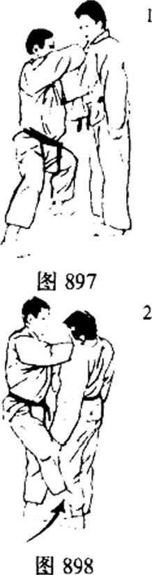 (3) 芍対方失火平衡,倒向自己的正侧方时,双方还是保持 握住的姿势,以免对方顺势倒下(图899)。