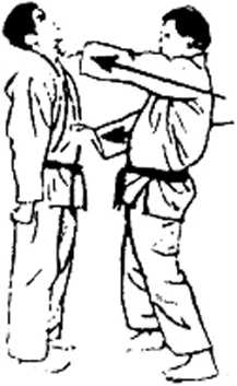 (4) 把対方抆到(1)的演武者的右脚边,在对方要倒下的一 瞬间,右脚以滑脚方式踏前一步,以双手突击倒对方 (图900),左手朝对方的喉*,右手朝对方的心窝下方,使出突技 (参M二十六手的35?37),