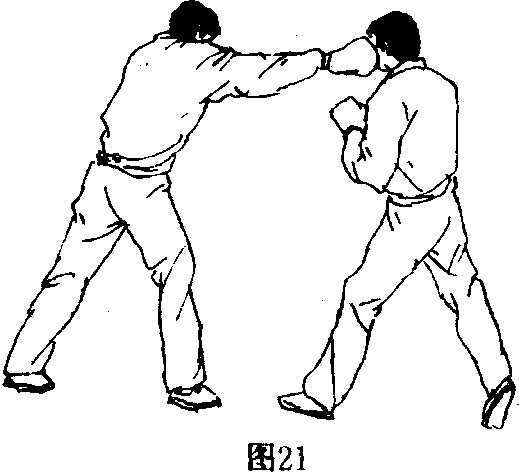 L [动作]乙实战步站好,手稍低,将面部空当暴露出来。 甲用直拳、摆拳进攻乙面部(图21)。乙下颌回收,牙咬紧,面 部肌肉紧张。初学者可用拳上、下、左、右击面部。
