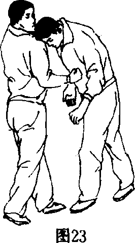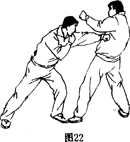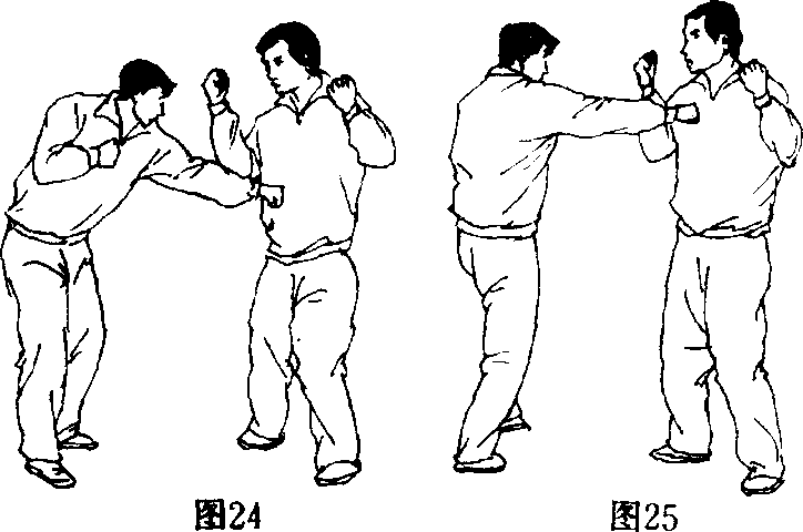 2[动作]乙实战步站好,手稍高一些,将肋、腹空当暴露 出来。甲用直拳、勾拳攻击乙腹、肋、胸部(图22、23)。乙被击 打时,可稍做上体后移或含胸收腹,但是不要退步、
