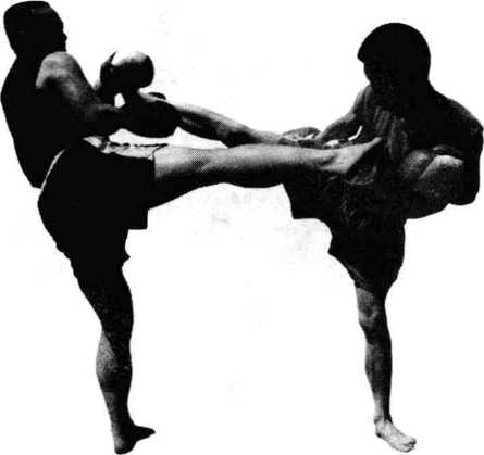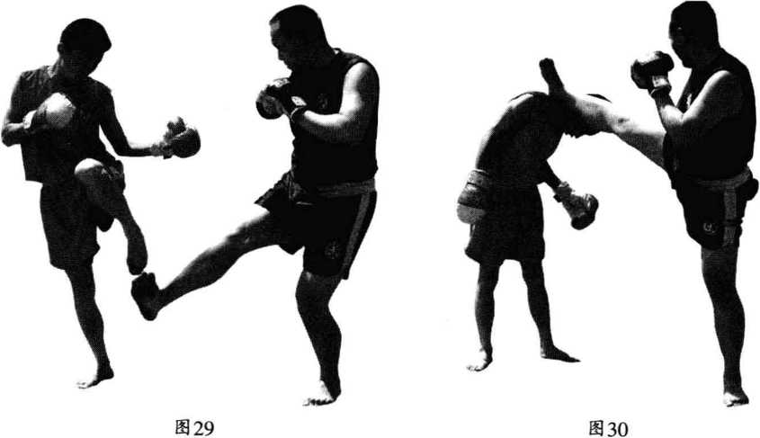 战例17:实战时,对手突然用右直拳抢攻我的面门,我快动应变,侧上左步用左手 向外拍击破化其来拳,同时发右低边腿狠踢对手左大腿外侧,使其受到重创,目视对手 (图31)。
