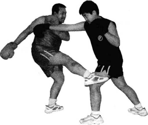 要点与提示:拍击来拳及时准确,右踩脚脚尖外展,送胯拧腿发力,力达脚底,意气 力相合。踩腿应向我体前斜下方发力,防守与进攻同动一致。