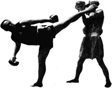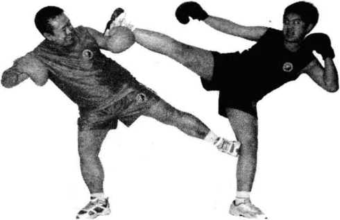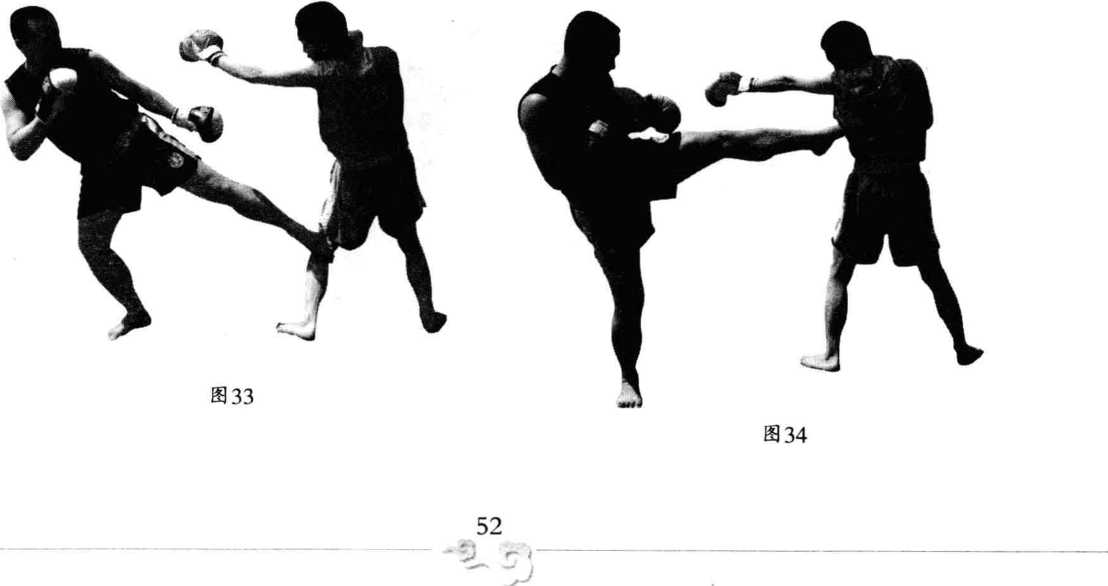 战例21:实战时,对手快发右高边腿攻 踢我头部,我快动应变,用双手十字接抱回 拉来腿破化,同时左转身发右横钉腿狠 踢对手胸部,使其胸部受到重创,目视腿方 (图35)。