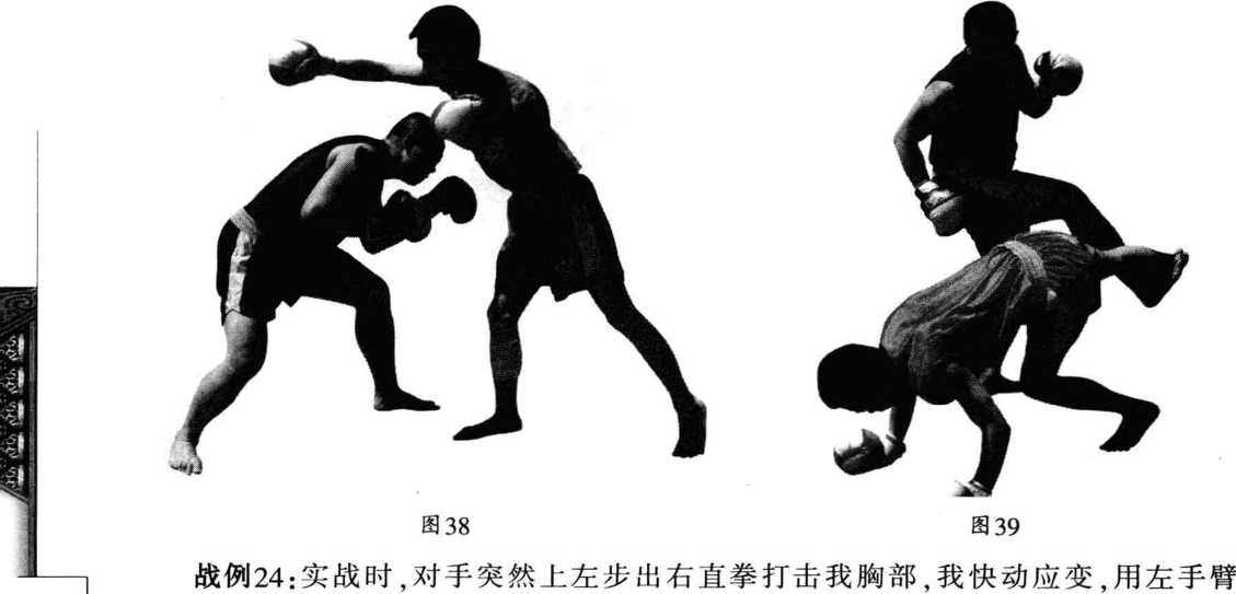 战例23:实战时,对手突然上右步出右横摆拳援打我头部,我快动侧闪左步下潜身 避化来拳,接着我连发右勾踢腿狠踢对手前支撑腿内踝处,使之跌倒在地,失去战斗 力,同时我双手回护体周,目视对手(图38、39)。