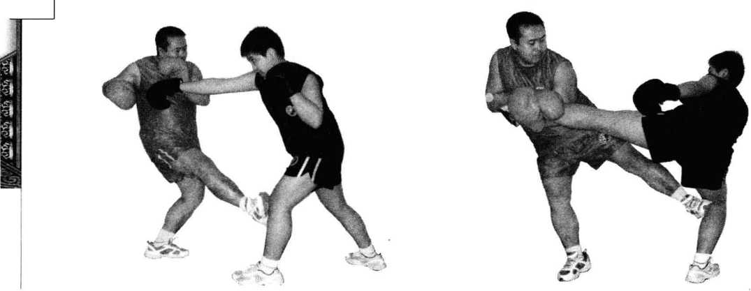 战例25:实战时,对手快发左边腿踢击我胸部,我快变身体右转,用双手上下锁抱