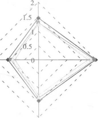综合不同级别最大力量相对值,将不同级别各指标相对值均值进行 绘图处理(图5-3),以更好的对比分析各个级別各个指标之间的差异 性。从下图可见,48哋级运动员各项相对力量素质位于闭合四边形 (雷达图)整体的外层,这表明48kg级运动员具备更为出色的相对力量 素质。而72kg级运动员的四项力M素质相对值,只有卧推指标略高于 55kg和63kg级,其余三项指标均小于其它各级别,处于闭合四边形的 最内层。从整体上看,四个级别的各项力量指标相对值大小基本按照从 小到大的级别顺序依次排列从表5 -15和图5 -3的比较结果表明, 运动员随着级别的增大,相对最大力M逐渐呈下降趋势,尤其是在中小