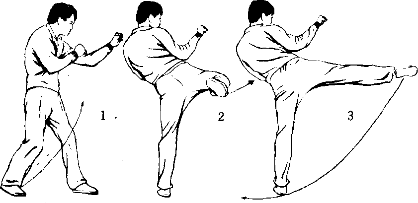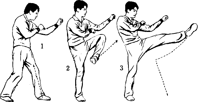 左格斗式(图70T)上体左转90" 身体重心稍后 移,右腿屈膝抬平,膝内转,膝尖向左,脚尖绷直(图 70-2),上肢姿势不变,随即右脚由右向左前方弹击,同时 呼气发力,力达脚背,眼视攻击方向(图70-3)。随后右脚 向前落步可成右摆势格斗式;也可向右转体向后落步还原成 左格斗式。