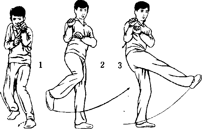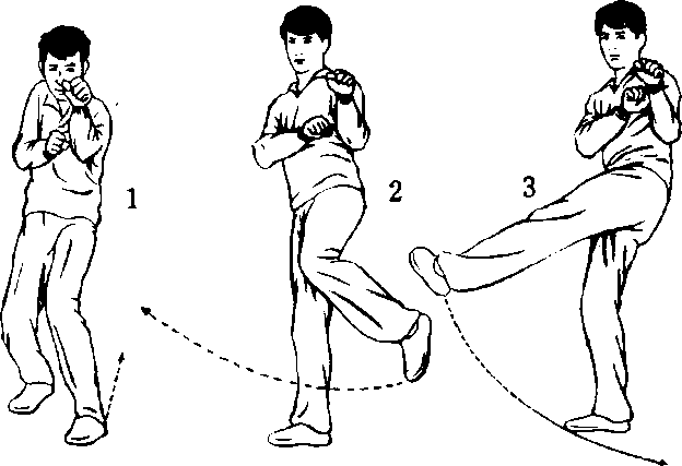 左格斗式(图797)。右腿支撑,左腿稍上抬,小腿后 上摆,勾脚尖,上肢姿势不变(图79-2),随即左腿由左侧 向右勾挂踢击,并呼气发力,力达脚背,眼视攻击方向(图 79-3) o随后左脚向前落步,还原成左格斗式。