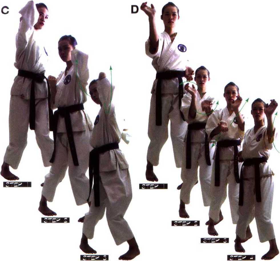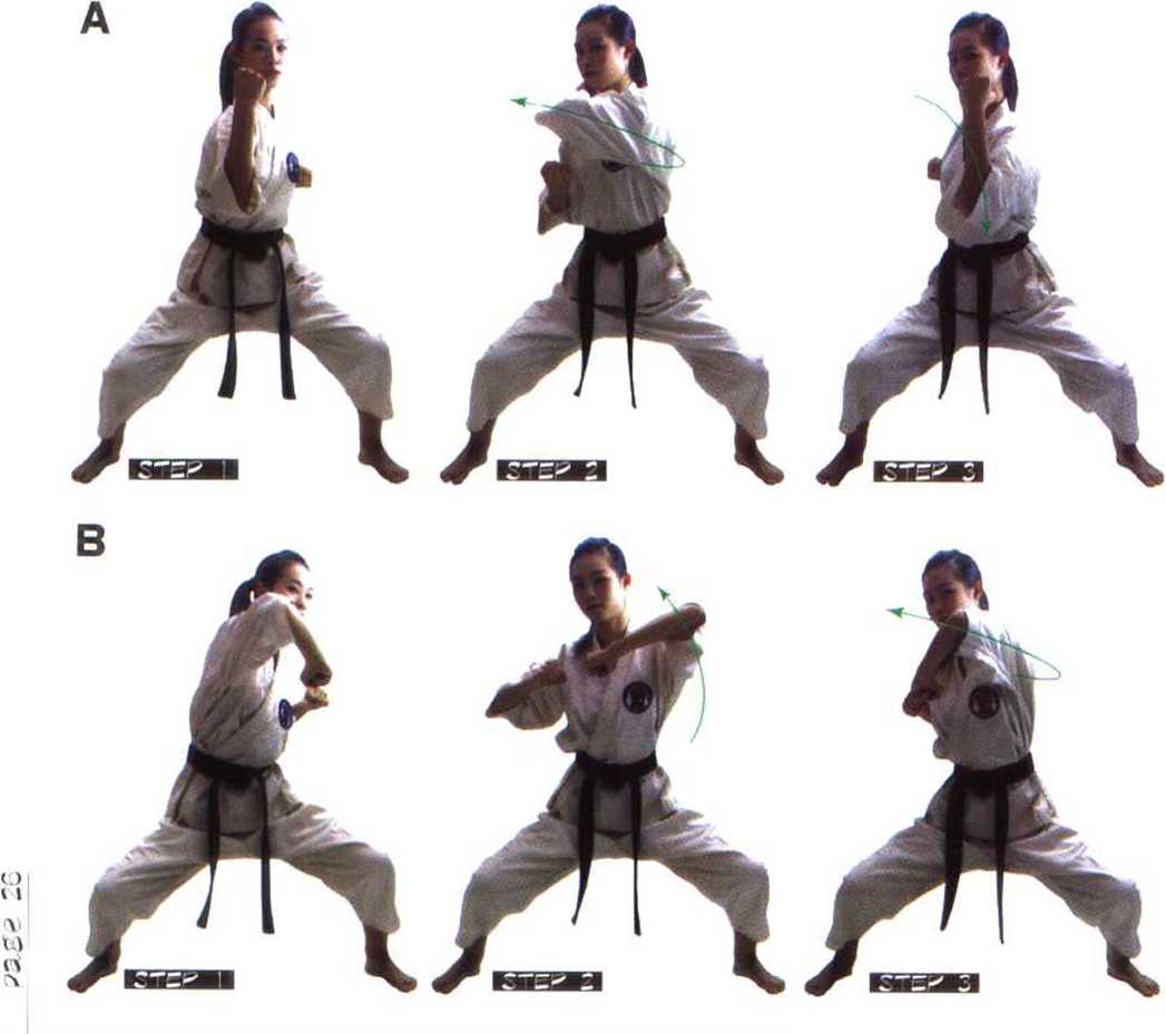 顾到短、中、长距离的打法。肘的威力不比手刀逊色,它常可以作为一种出 其不意的攻击手段、令人难以招架。好吧!我们看看这几组动作的要点:A组 的仁俯击在练习时要注意身体的重心,尽量保持上身挺直,在出招时不要过