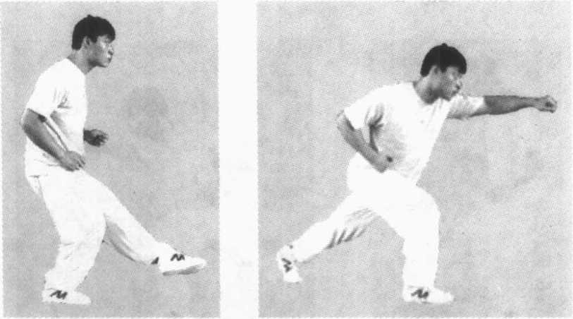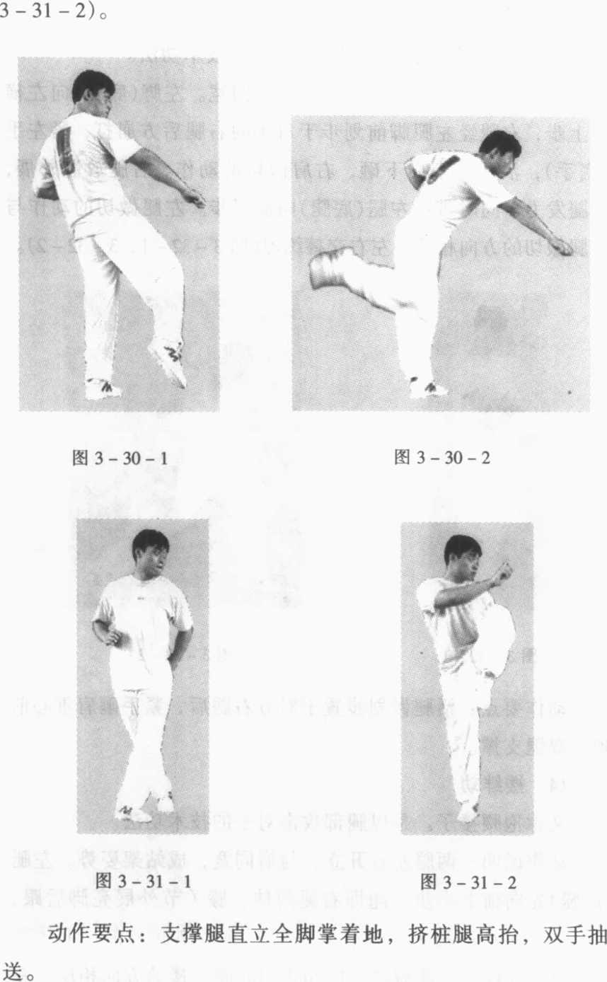 动作说明:两腿左右开立,与肩同宽,两手自然下垂。左 腿(活腿)向右斜方上步,右腿(底腿)跟步,同左脚平行,左腿 随之向上顶抬,双手向顶抬腿斜上方抽送。右腿顶挤时动作要 领与左腿顶挤的方向相反。左右交替练习(图3-31-1、