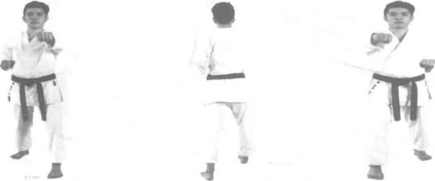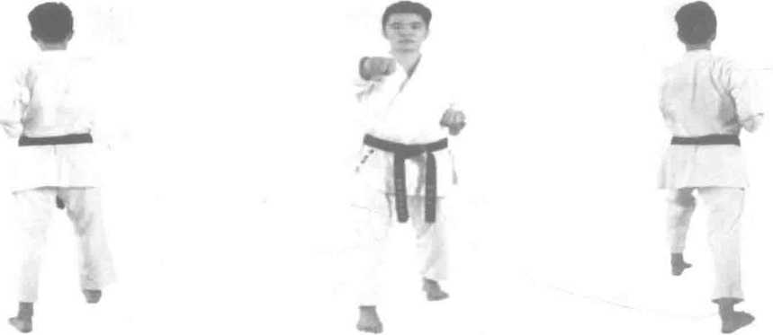 图207 (背面) 右脚上前一步 基立右手中段 冲拳