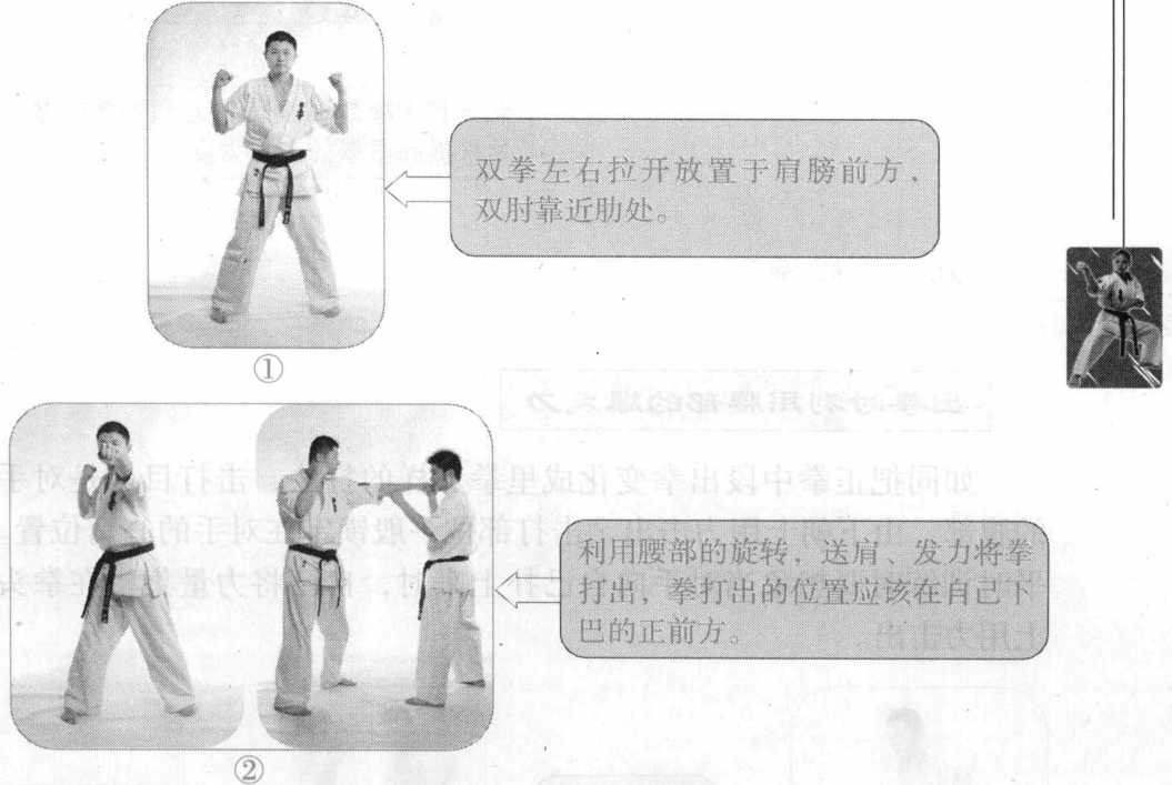 沿肩膀高度出拳收紧两肋,把双拳架到肩膀两侧与下巴同高,然后把攻击意识放 在进攻对手的下巴上,稍旋身体直线将拳打出。这种拳法与正拳中 段拳的不同点在于,拳一旦打出要马上收回。注意点是腋下不可露 出空当。