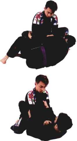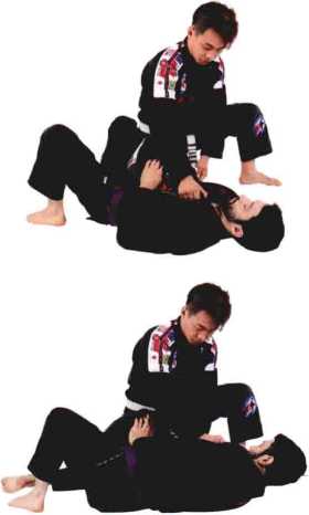 这里很多人易犯的错误是,想直接推开对 方压住自己的膝盖,这很难。和侧位的逃脱同样 的道理,甲方必须侧着身体再想办法。记住,永