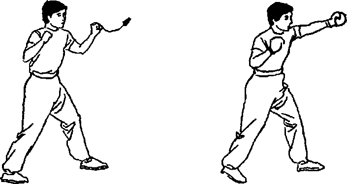 〔要点〕弹拳之前手臂肌肉尽力放松,陡然发力。出拳 时顺肩送肘,松腕甩出,伸肩丢臂,弹出即回。