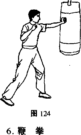 回。空打分组练习,双手分别练习,练至抖手即出,一出即 回,松活自如,再进行打沙袋练习,分组练习,每组100 次。共10组。(图124)
