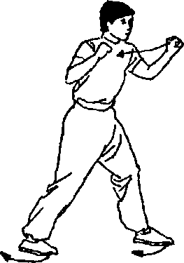〔练法〕格斗势站立,全身放松,突然抖肩弹拳立即收