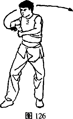 上动不停,借扭腰转胯之力右肘随转忽停,使小臂向右 侧反手横抽打出,拳眼向上,力达拳背。(图127)