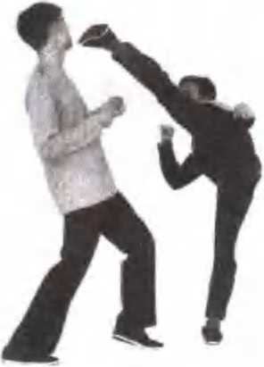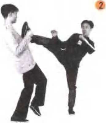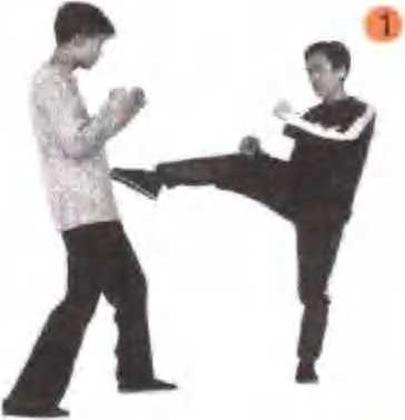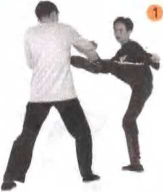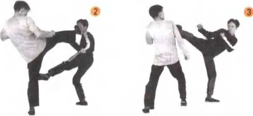 第一腿可稍发力踢击,在乙方有所行动时,趁机 随势连续发腿重击。