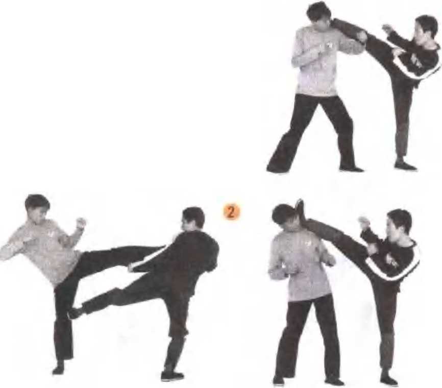 不同腿法的连击,必须注意乙方的动作变化,伺 机连攻。