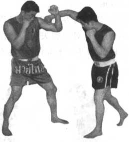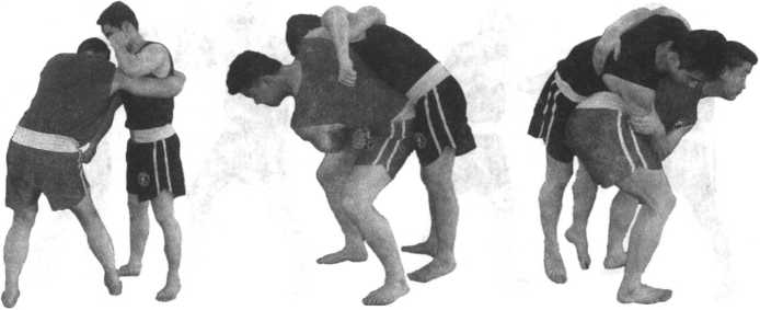 双方对峙当对方用右摸拳进攻时我用左臂格挡随即左手以拳变掌外旋、抬肘、顺势扣拉对方右臂至腋下、沉肘夹臂、锁住对方右臂。我右脚随即向左上方上一步身体左旋屈右臂抱紧对方背部同时左脚跟进一步两腿弯屈以臀顶其胯部。动作不停两腿蹬伸、提臀、弯腰。在对方重心离地的瞬间拧腰变脸将其摔倒(图5-20至5-26)。注意锁臂旋拉上步靠身、抱背动作流畅蹬伸、变脸要协调。