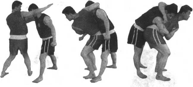 双方对峙当对方用右搬拳进攻时我用左臂格挡随即左手以拳变掌外旋、抬肘顺势扣拉对方右臂至腋下、沉肘夹臂、锁住对方右臂。我右脚随即向左上方上一步身体左旋屈右臂穿过对方左臂同时左脚跟进一步两腿弯屈以肩挑式顶住对方的腋窝。动作不停两腿蹬伸、提臀、弯腰。在对方重心离地的瞬间拧腰变脸将其摔倒(图5-27至5-33)。注意锁臂旋拉上步靠身、穿臂动作流畅蹬伸、变脸要协调。