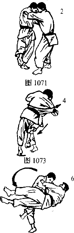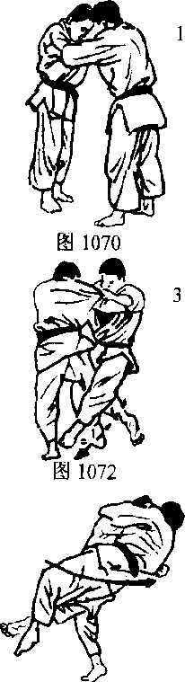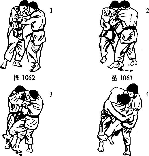 图1064图1064图1065图1065图1066图1066图1068图1068图1069图1069(1)采取左自然体的架式右手抓住对方的左衣领,左手抓其右衣领部分。对方拉住我方的左手要引诱我踏出左脚发动脚侧内钩法之攻击。