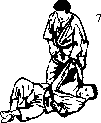 如果对方的右手之推力很充足的话则我方的左肩就会往下垂。如此一来我腰部的扭动几乎不可能因此对方欲将其右脚踏进我两脚间时,我右脚必须移到对方的左脚尖前。