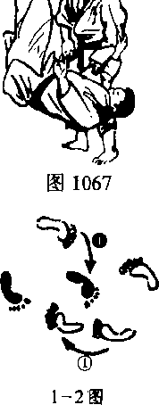 对方用左脚发动脚侧内钩法攻击我时,我左脚贴在对方的右膝盖一带借力反击使对方倒下。如图1062-1068。步法见图10690