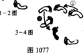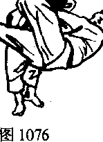 当对方向我左脚扫过来欲摔倒我时我于自己前面扫对方的这只脚。使其失重摔倒如图1070-1076。步法见图1077图1074图1074图1075图1075(采取右自然体的架式左手抓住对方右袖中间的外侧部分,右手则抓其侧胸一带。对方伸出右手,欲将我左肩拉过去其左脚自后方踏到前面来。