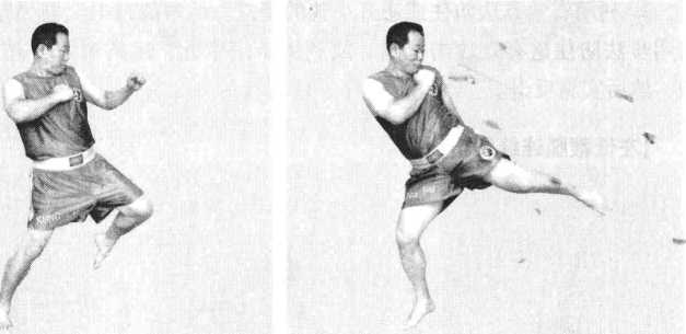 实战姿势开始。左腿屈膝快速前上提膝左小腿随大腿自然提起绷左脚尖左膝接近腰的高度时迅速右转腰、扣左膝同时右脚跟以前脚掌为轴内旋左小腿前下方鞭打横击右拳护于颌下左拳左下摆于左大腿侧打击完成还原成实战姿势。