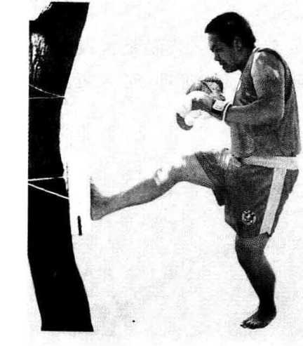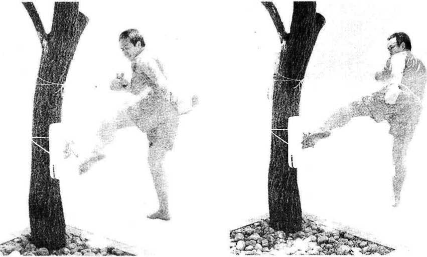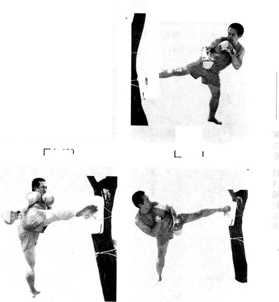 (1)固定脚靶踢击练习者将单个或多个脚靶捆绑在粗树干或木桩上进行单腿或组合腿踢击脚靶练习同时双手随动体周例如低边腿连踢、踩腿、低踹腿、高边腿、中踹腿踢靶练习