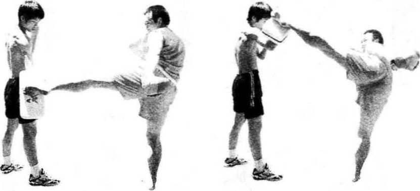 要点双人踢靶分有单靶、双靶、定位、移位等多种练习。要求示靶者出靶快捷、到位、有力要求踢靶者反应机敏有感而应踢靶凶狠劲力通透。左右腿练习每次练习时间20?30分钟。