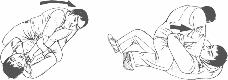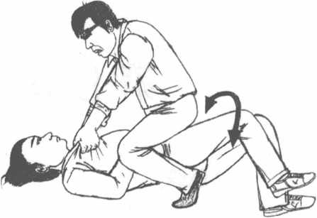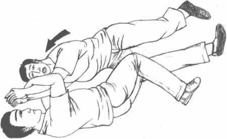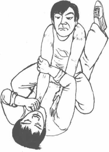 万一对方是个颇富打斗经验的盗贼不畏于你的抵御架势或者躲开你的大力顶膝再度骑上你的身体。这一次对方可能更拼命所以又回来扼你的脖子时你要用两手将对方手肘的部分向横侧紧束用尽力气直至其两肘靠拢为止然后抓着对方的两肘向横侧倒。因两肘完全受到遏制所以对方一定不能动弹。(图7-4?6)