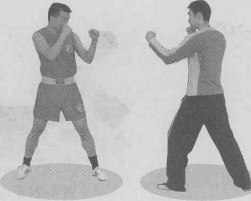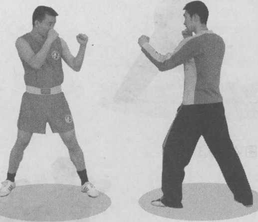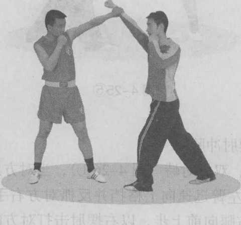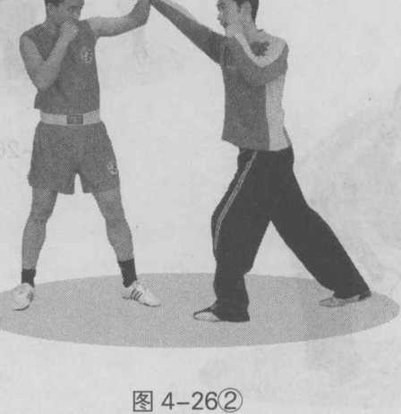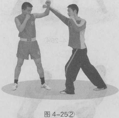 动作方法双方对峙(图4-25),当对方用右直拳进攻