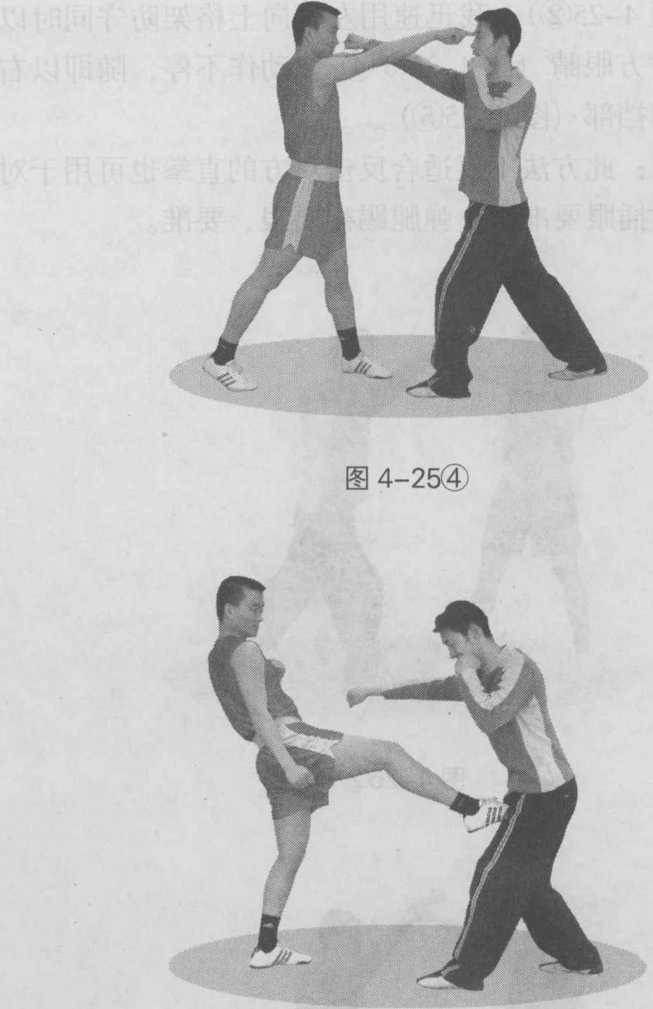 我头部时(图4-25),我迅速用左臂向上格架防守同时以右手插指攻击对方眼睛(图4-25)动作不停随即以右弹腿攻击对方的裆部(图4-25)