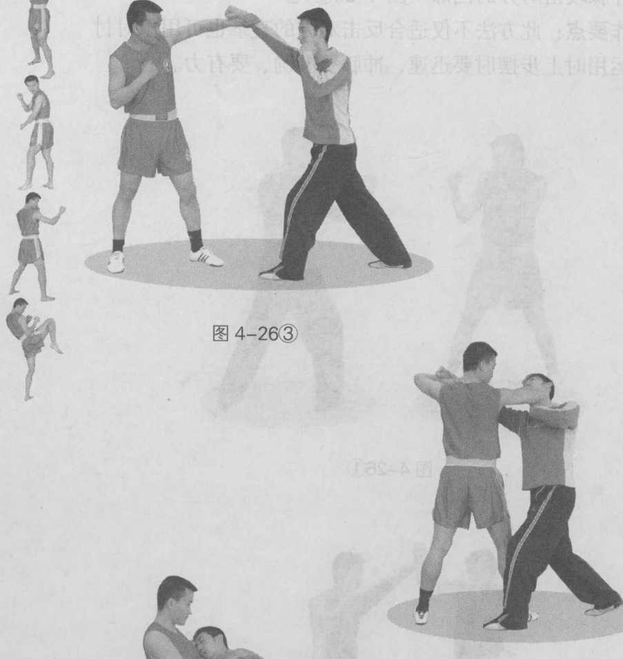 动作方法双方对峙(图4-261)当对方用右直拳进攻我头部时我左臂迅速向上格挡并反抓对方右手臂(图4-2623)同时右腿向前上步以右摆肘击打对方的面部或肋部(图4-26(3))。动作不停随即双手抓住对方上体下拉同时