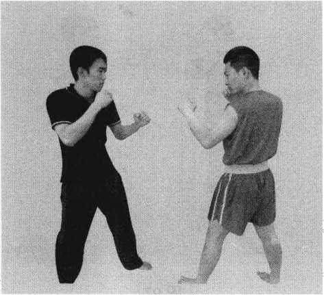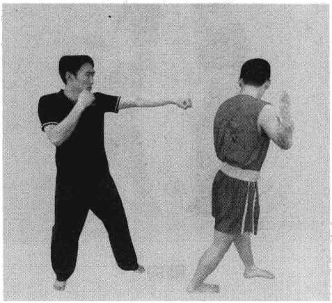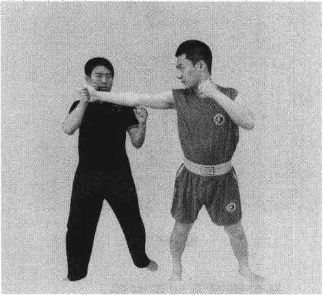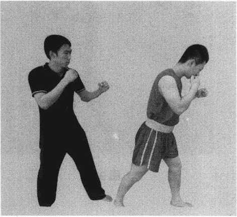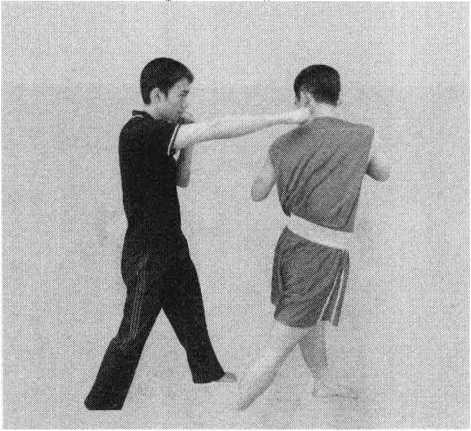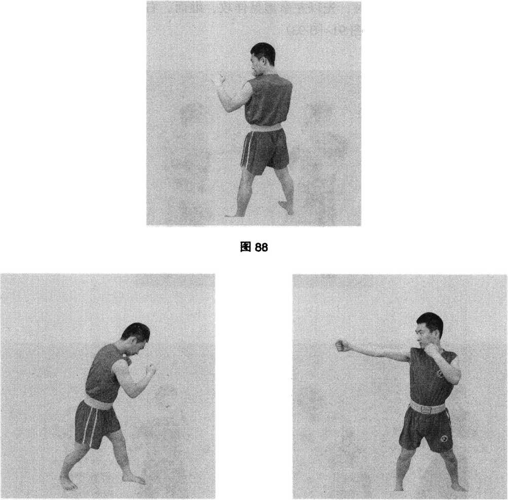 例(1)双方对峙时先以左拳虚晃佯攻继而右脚插步身体右后转,右鞭拳横击其上盘。(图91-图93)