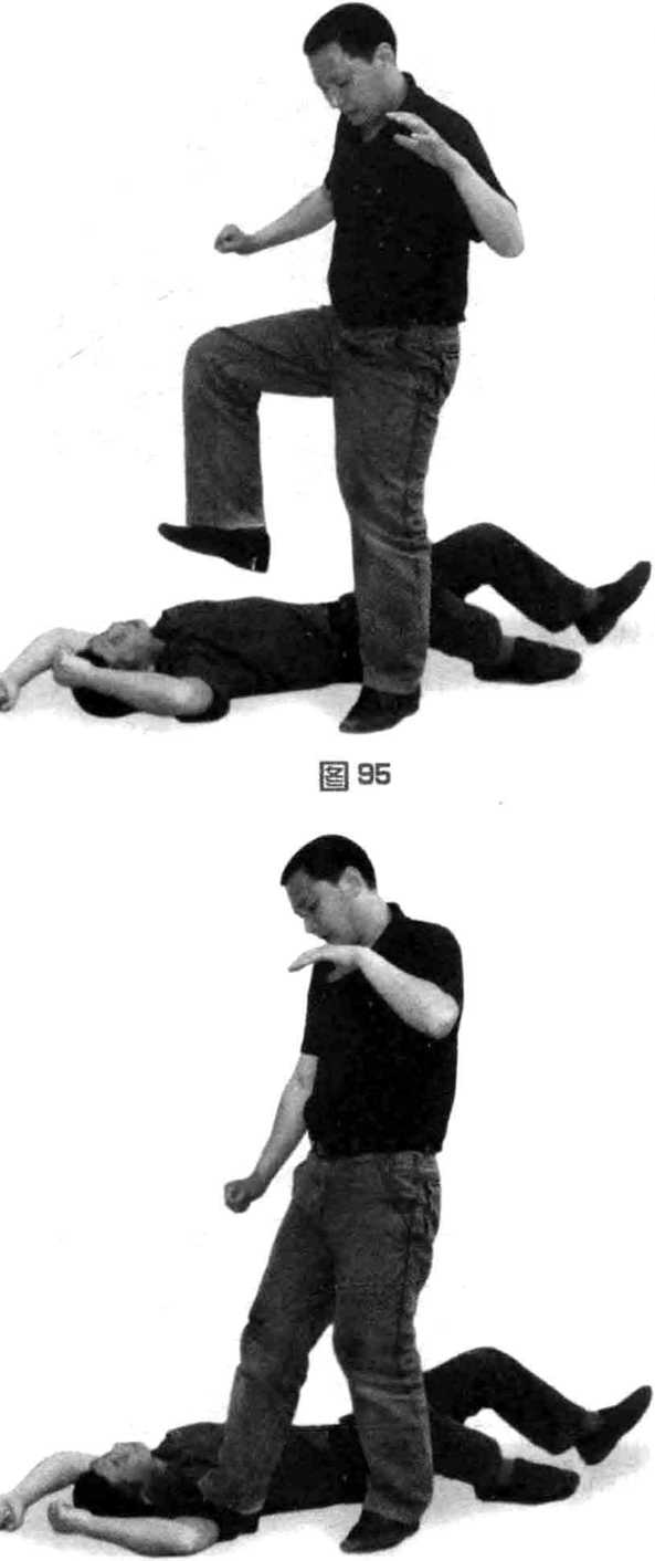 以足底与足跟对倒地歹徒进行践踏的攻击行为(图95、图96)。此项技术也是由站立方采用的腿法攻击倒地歹徒的打击技巧。一般
