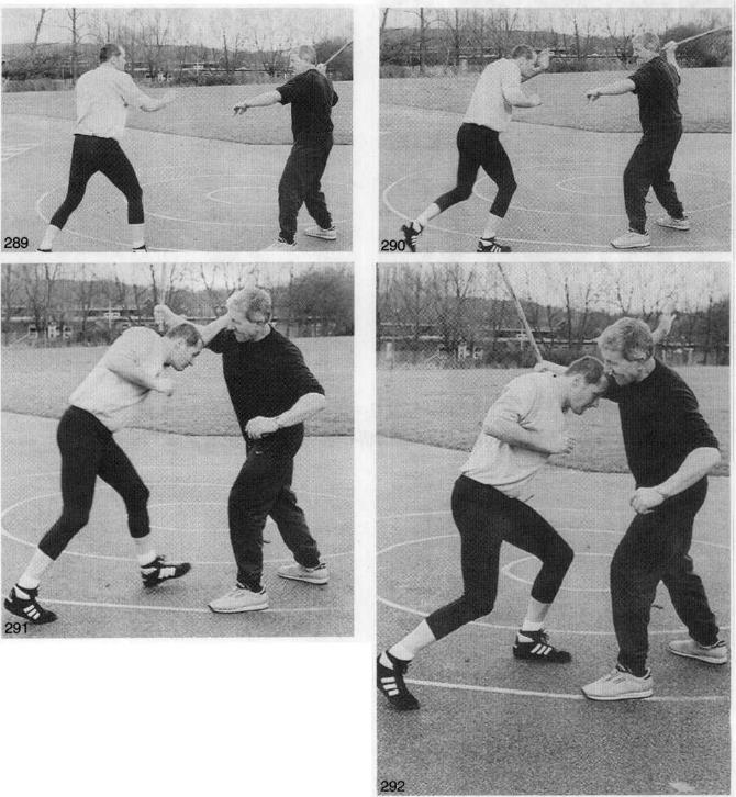 雅氏科尔格挡法也能够很好地防御冲击性武器的进攻比如瓶子、台球杆或棒球棒(经过训练它甚至可用来拦截手持刀子的敌人)。例如在图289中敌人举起台球杆成一个进攻性的威胁姿势。你在他试图进攻前要先发制人进行攻击(图290),首先就使用雅氏科尔格挡法(图291)利用向前冲击的动能以头撞击敌人的面部就像图292中那样(受到如此猛力的头部撞击他必将受伤)。根据相应的反应再采取行动这取决于当时的情形。