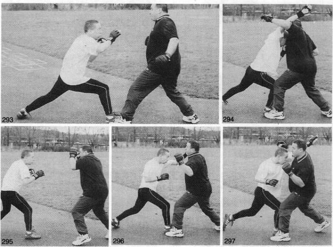 让陪练者站在你的前方以任意拳法进行攻击。当你能熟练地防守任意冲拳时再让陪练者用两到三个动作的组合进行攻击。开始慢一些你配上相应的步法向前移动。很快你就能让对手进行全力击打用全部的力量和速度攻击你。你也许会被打着甚至会被打倒(如果你担心被打得鼻青脸肿的话也可以戴上护头)但是运用雅氏科尔防守法的成功率将比其他任何格挡法都高。恰当地进行练习让陪练者努力地打击你的头(图293、图294,图295、图296、图297)或你的肋部都很重要!