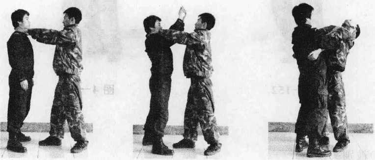 要领我两手迅速由敌两臂间向前上方环绕穿出(4—157),上右步同时将其双臂内合向上反关节托拿还可用手掐住其下唇(图4-158)