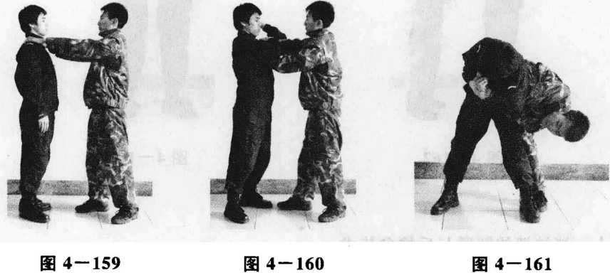 要领脖被掐时(图4—159),我右手向左从敌两臂上方扣抓住其右手背屈左臂上抬向右转身(图4—160),左脚后绊敌左腿同时左手向左后反关节推敌肘(图4—161),将其制服。
