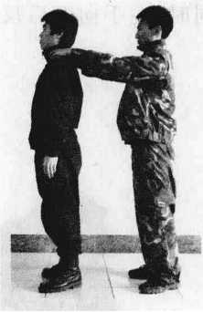 要领我迅速低头运气外撑喉部双掌插击敌两肋两手迅速由内抓敌两肩猛力后拉同时起右膝顶击敌裆。乘敌低头之机顺势用右臂搂挟敌颈将敌制服。