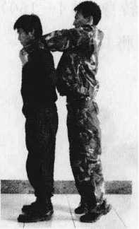 要领拧指背摔。敌由后双手掐我脖子时(图4—162),我用两手迅速由我颈后扣抓其拇指鱼际部位向下翻拧前拉(图4—163),使其身体紧贴在我背后我乘